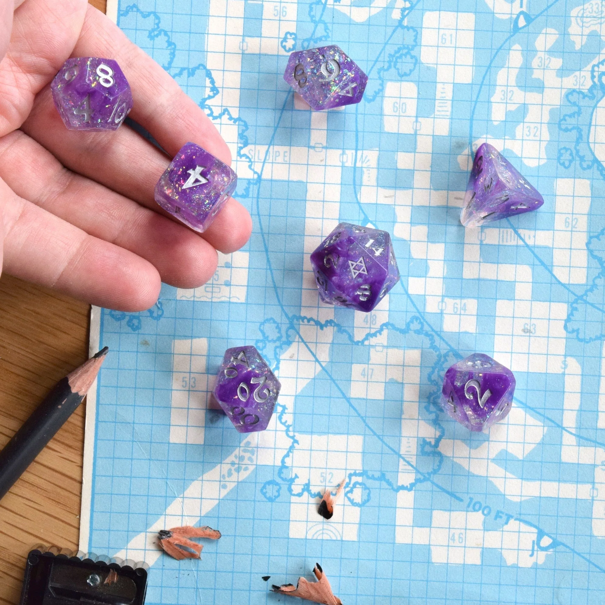 This is a 7 piece polyhedral dice set in Die Hard Dice's Avalore mold.