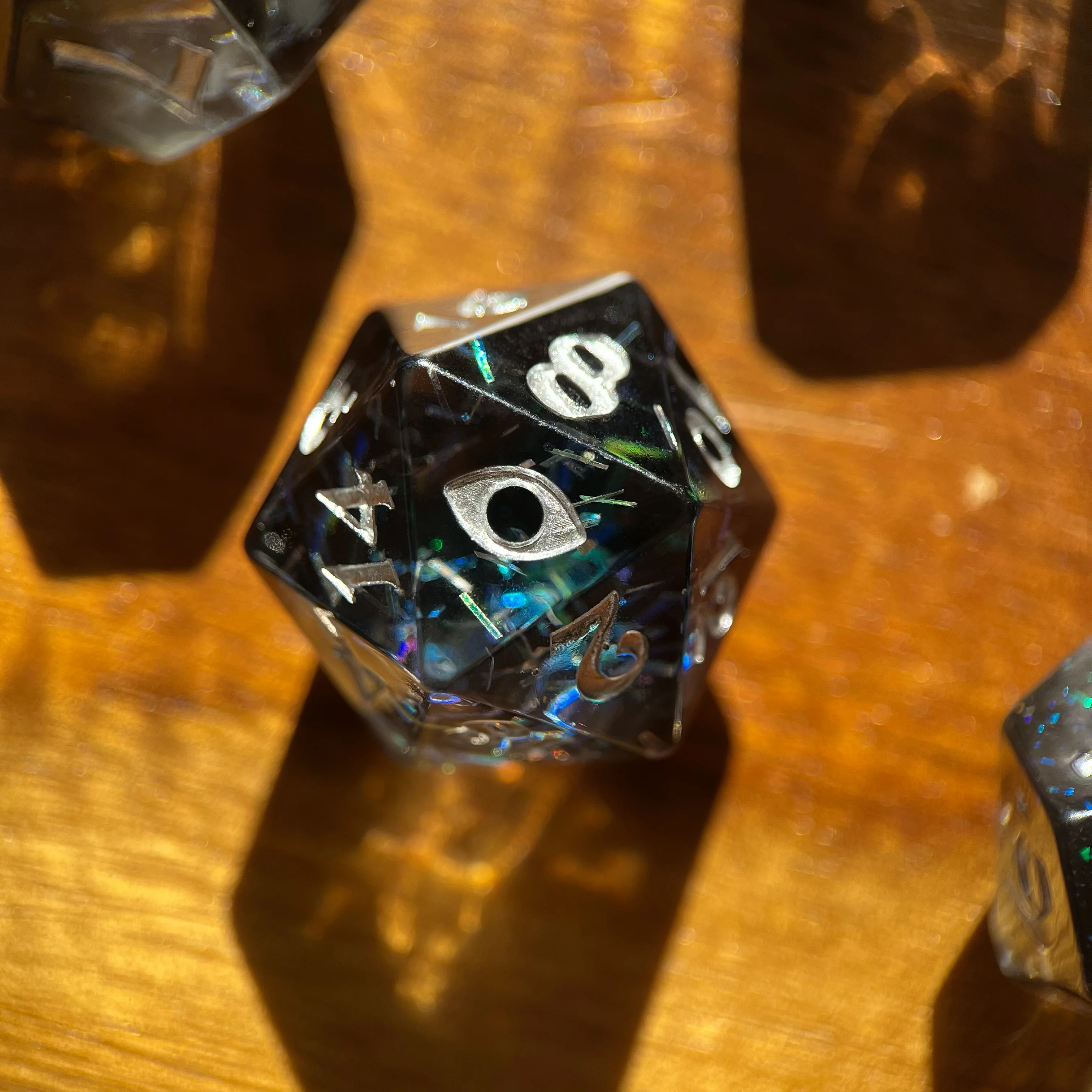 Designed by artist and maker Evewynn (Aron Jean), and created in partnership with Die Hard Dice. See more of her work at www.evewynn.com. This glittering polyhedral set comes in a velvet bag embroidered with silver thread.